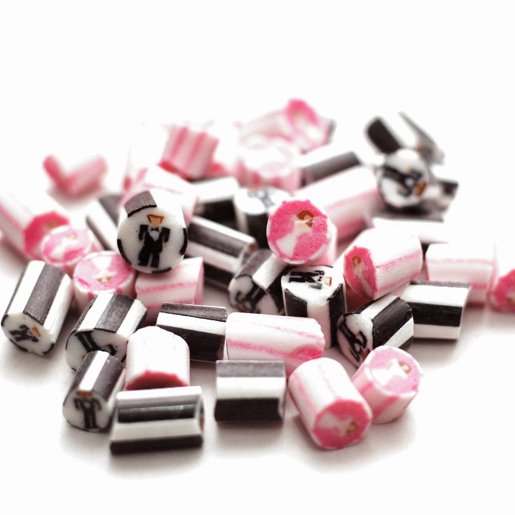 The elegant Bride in her white gown and veil and the handsome Groom is in his black tuxedo. To distinguish, pink and white or black and white casing stripes on the outside. They can come mixed together or separate.