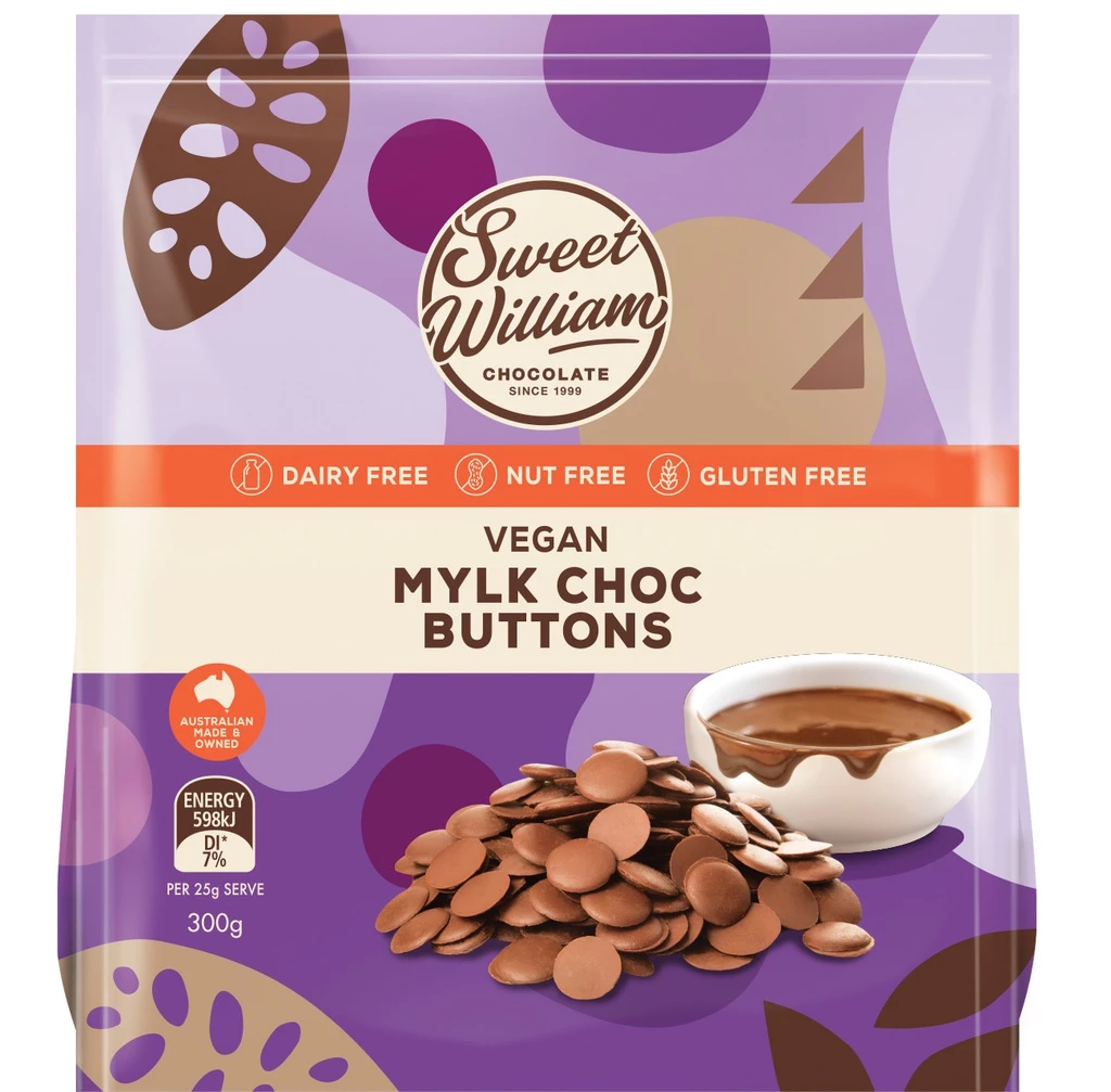 Dairy Free Milk Chocolate Compound Buttons, packed with real chocolate flavour. Sweet William Chocolate is Dairy Free, Gluten Free, Nut Free & Vegan, making it a great chocolate for everybody to enjoy. Use these tasty cooking chocolate values for your dessert creations.