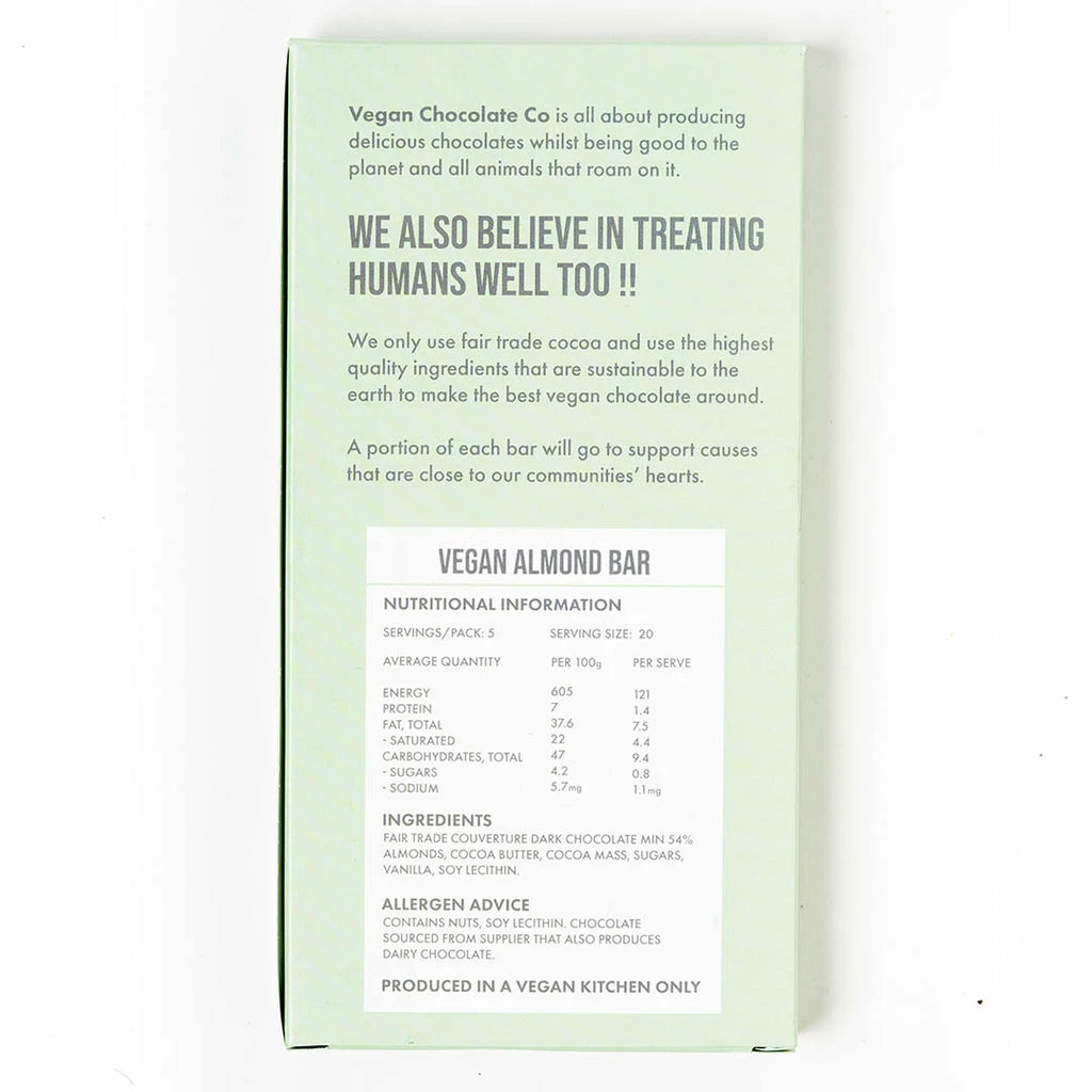 Ingredients: Fair Trade Couverture Dark Chocolate Min 54% Almonds, Cocoa Butter, Cocoa Mass, Sugars, Vanilla, Soy Lecithin.